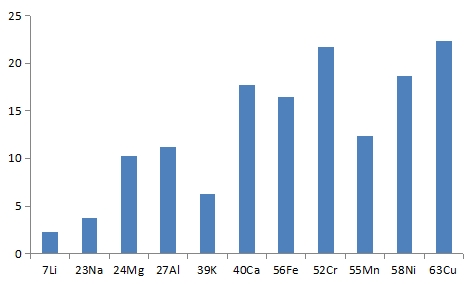 采用ICP-MS 2000測定高純石英砂中13種雜質元素,背景等效濃度在0.6ng/L~60.0ng/L之間,方法檢出限在0.3ng/L~88.2ng/L之間,加標回收率在82.1%~120.4%之間,精密度在1.41%~6.92%之間,滿足石英玻璃行業高純石英砂的測試要求。同時該方法也適用于光伏玻璃、高純二氧化硅、氣相二氧化硅等材料中雜質元素的分析測試。