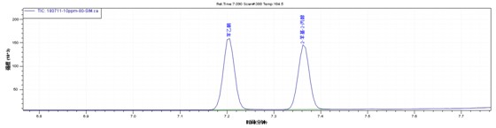 目標物在0.1ppm-2ppm線性良好。取空白鞋材樣品加標,樣品經過丙酮超聲萃取。1ppm加標水平下譜圖如下,得到了比較滿意的效果。