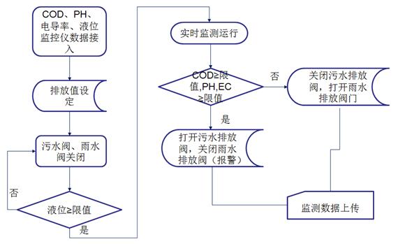 監測系統控制采樣單元將水樣導入監測室,并啟動監測水質的COD、pH、電導率等常規參數。達標雨水通過電控閥門排入市政雨水管網,一旦超標電控閥門關閉,禁止雨水排入市政雨水管網,并通過水泵將超標雨水泵入企業污水處理系統處理,達標后排放至市政污水管網。同時所有監測數據經由數據采集單元將數據統計后,由傳輸設備傳輸至企業監測中心或環保局,由此完成對雨水排放自動、實時、連續監控。