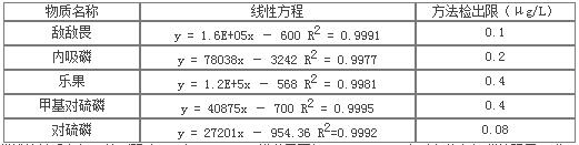 結(jié)果表明6種有機(jī)磷線性關(guān)系良好,檢測(cè)限為0.08~0.4μg/L,能滿足國(guó)標(biāo)GB 3838-2002中對(duì)六種有機(jī)磷的限量要求。