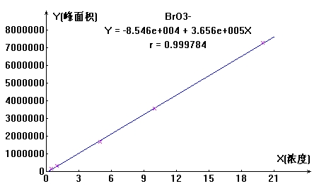 按照溴酸根各濃度點依次進樣,計算其峰面積,以濃度和峰面積繪制標準曲線,線性相關系數為0.9997,結果詳見圖2。