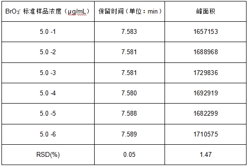 取5.0μg/mL溴酸根標準溶液重復進樣6次,考察保留時間和峰面積的重現性,重現性結果詳見表3。